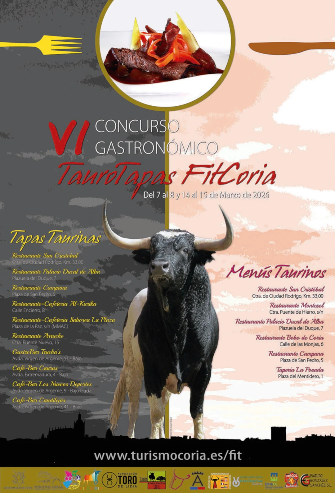 Derivado de la imagen taurina de la Ciudad de Coria, al estar vinculada ésta desde tiempos inmemoriales con el toro de lidia a través de sus ancestrales y tradicionales Fiestas de San Juan, se ha convocado el Concurso Gastronómico “TauroTapas FitCoria” con el objetivo de fomentar, conservar, sostener y promocionar la defensa del toro y de la cultura taurina coincidiendo con la celebración de la Feria Internacional del Toro de la Ciudad de Coria (FITCORIA).