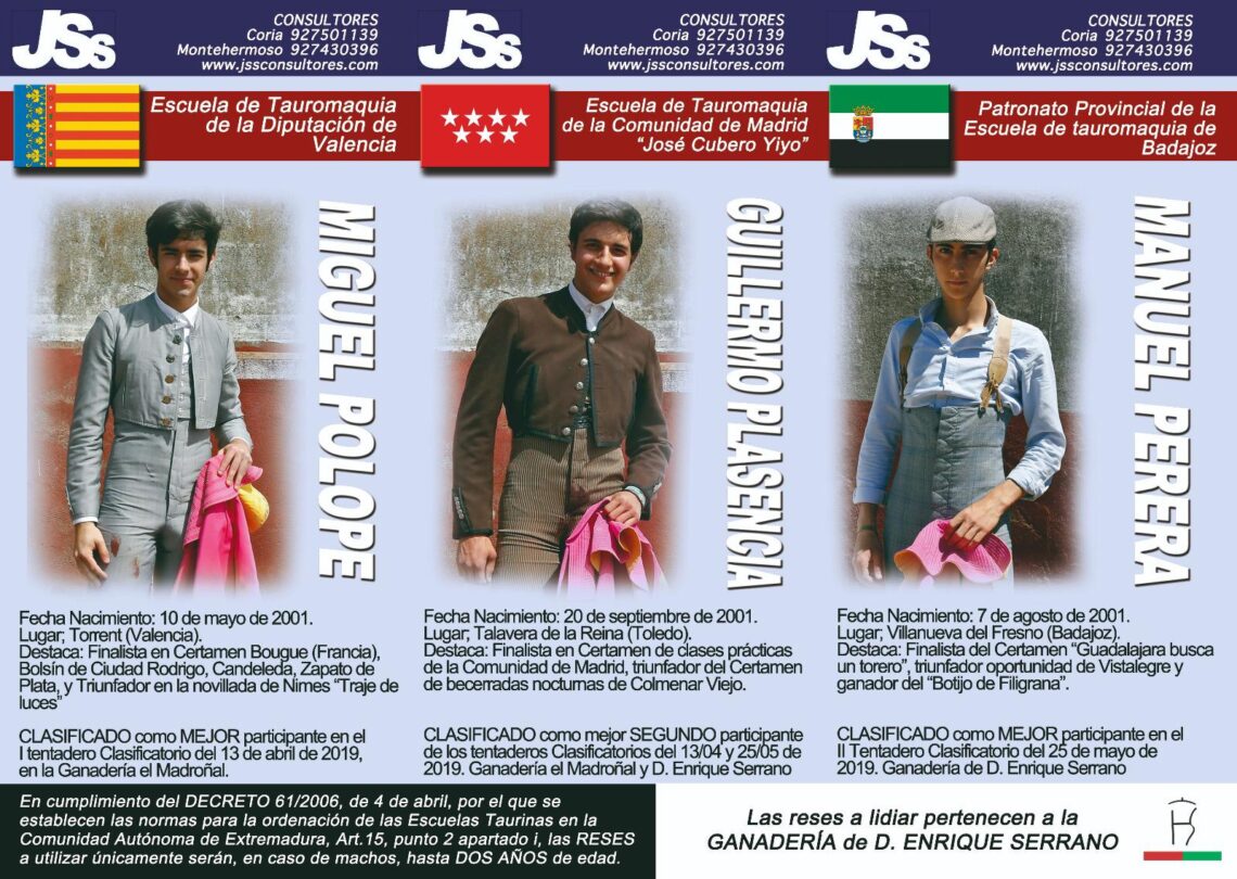 La final se disputará entre los jóvenes Miguel Polope, de la Escuela Taurina de Valencia, Manuel Perera, del Patronato Provincial de la Escuela de Tauromaquia de Badajoz y Guillermo Plasencia, de la Escuela de Tauromaquia de la Comunidad de Madrid “José Cubero Yiyo”. El evento será celebrado en la Plaza de Toros de Coria el día 29 de junio a las 21:00h. El sorteo se realizará a las 17:00h y los becerros, menores de 2 años, que se lidiarán procederán de la ganadería de D. Enrique Serrano.