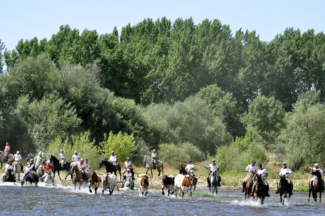 Zona del Encierro Coria, Cáceres, EspañaRecuerdo de los antiguos encierros de bueyes y capeones a caballo por las dehesas y los campos de esta tierra para conducir a los toros acompañados de ganado manso hasta los chiqueros de la efímera Plaza de Toros de la Ciudad de Coria. Una costumbre y unos trayectos que hoy día se recuerdan dentro de las Fiestas de San Juan a través del tradicional traslado de cabestros a caballo desde la Dehesa Boyal de Mínguez, vadeando el río Alagón, hasta llegar a las puertas de los legendarios muros de la Ciudad Antigua acompañados por más de un centenar de caballistas que se agolpan, en torno a la parada de mansos, ante la expectación del público que observa expectante en caminos, calles, vallas, tendidos, balcones y enrejados. Recorrido: Puente Medieval y Barreras del Cubo, para entrar en el recinto amurallado por la Puerta del Carmen y después de recorrer varias calles ser encerrados en las corraletas situadas próximas a la calle Mártires.