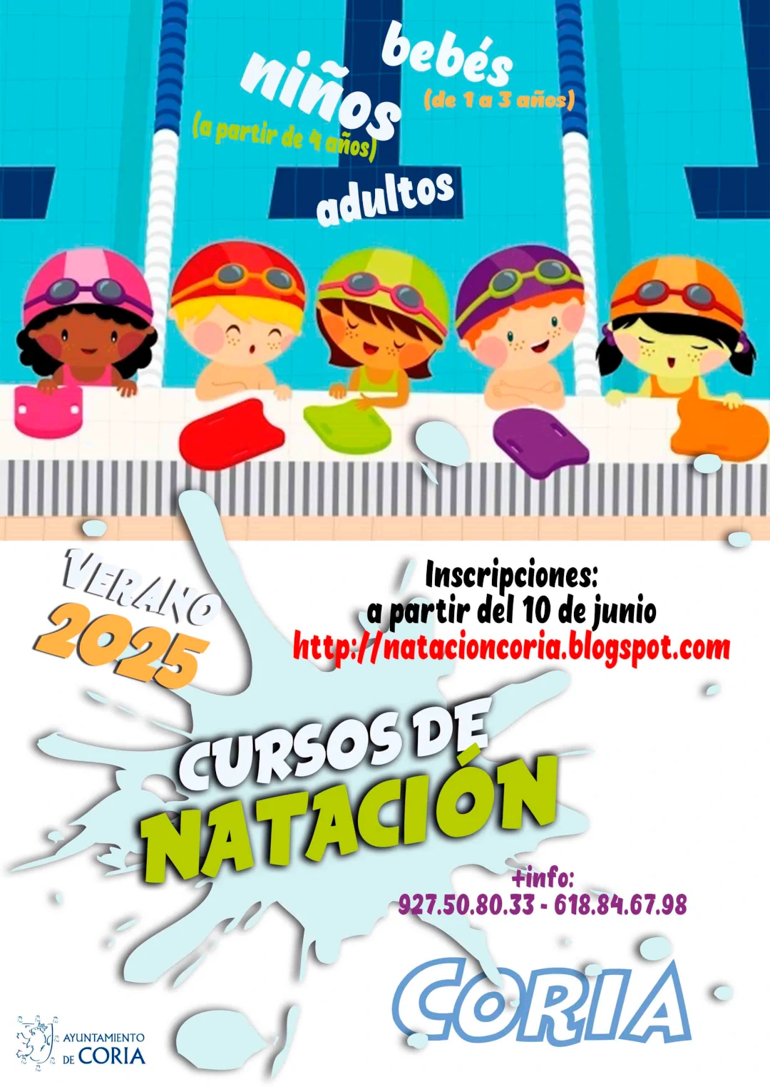 Ayuntamiento de Coria Plaza de San Pedro, 1, Coria, Cáceres, EspañaLugar: Coria-Puebla de Argeme-Rincón del Obispo.Destinatarios: Bebés (1 a 3 años) – Niños (4 a 13 años) – Adultos (apartir de 14 años).Turnos: 1º del 1 al 15 de julio – 2º del 16 al 31 de julio – 3º del 1 al 14 deagosto – 4º 18 al 29 de agosto.Cuota de inscripción: 18 €.Organiza: Concejalía de Deportes. Más información e inscripciones en la sección de los Cursos de Natación, pincha aquí.