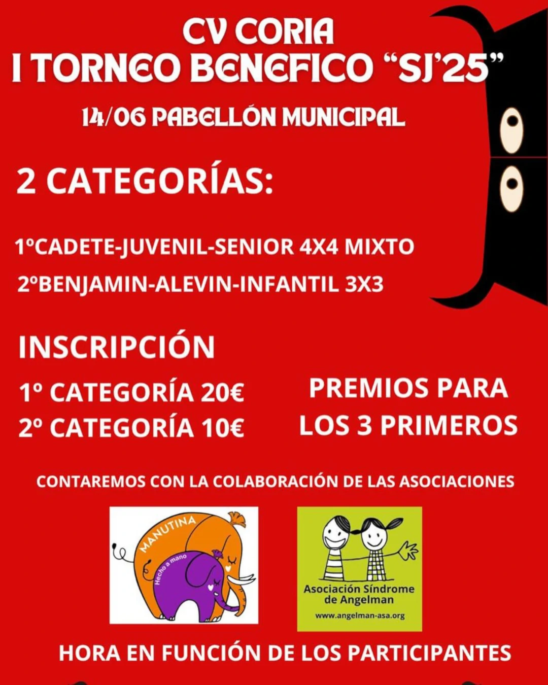 Pabellón Municipal de Deportes Calle Olimpiada, s/n, Coria, Cáceres, EspañaEl Club Voleibol Coria organiza el primer Torneo Solidario "San Juan 2025" con la colaboración de la Asociación Síndrome de Algelman y la Asociación Manutina. Dispondrá de dos categorías: 1ª Cadete-Juvenil-Senior 4x4 Mixto 2ª Benjamin-Alevin-Infantil 3x3 Premios para los tres primeros. Inscripción 1ª Categoría: 20€ 2ª Categoría: 10€ Inscripciones: voleibolcauria@hotmail.com