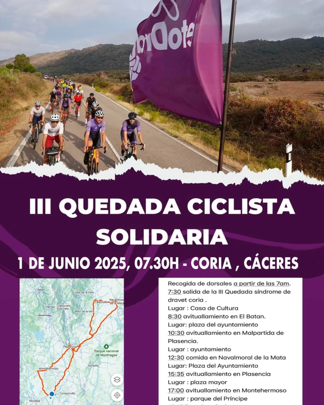 Esta quedada ciclista se trata de una quedada ciclista solidaria para visibilizar el síndrome de Dravet, una enfermedad rara que comienza en el primer año de vida. El recorrido previsto tiene 225 km y 2.100 m de desnivel positivo acumulado. Discurre por carreteras en buen estado de las comarcas del Valle del Alagón, Valle del Jerte, Campo Arañuelo, la Vera y vuelta al Valle del Alagón, recorriendo buena parte del norte de la provincia de Cáceres en un entorno variado que ofrece cambios de paisaje y vistas espectaculares. Se trata de un reto personal y cada participante debe ser consciente y responsable de hasta dónde llegan sus fuerzas. Se trata de una quedada, no es una marcha organizada ni una competición. El objetivo principal es visibilizar esta enfermedad rara a través del ciclismo. Es una quedada y, a la vez, un reto personal, en el que la Organización ayuda, con apoyo de personal, tanto en vehículos como en bicicleta, y con avituallamientos, a quien quiera cubrir la elevada distancia en bicicleta de que consta la marcha. Cada participante es responsable de sí mismo y de los daños que pudiera causar a terceras personas. Se contará con avituallamientos y vehículos de apoyo, que deben ser considerados siempre como una ayuda para completar el reto. Es un reto exigente por la distancia y cada participante deberá valorar su estado de forma. El grupo deberá rodar lo más compacto posible, con respeto escrupuloso a las normas de tráfico y a las instrucciones dadas por la Organización. Siempre habrá, al menos, una persona de la organización en cabeza marcando el ritmo al objeto de facilitar que el grupo permanezca compacto y marcar el ritmo. También habrá personas de la organización en cola con el mismo objetivo. El hecho de participar supone la aceptación de estas instrucciones. Se ofrecerán avituallamientos en: El Batán, Malpartida de Plasencia, Navalmoral de La Mata (comida), Plasencia y Montehermoso. Para participar en la actividad, se ha establecido una donación mínima de 10,00 euros, pero el máximo será totalmente voluntario. Las donaciones se destinan directamente a la Fundación Síndrome de Dravet y servirán para apoyar la investigación de la enfermedad. Además, a través del dorsal solidario cualquier persona podrá realizar la donación voluntaria que desee aunque no quiera participar en la marcha. Las donaciones se pueden realizar online a través de esta misma página o a través de cuenta bancaria (ES44 2100 2139 6802 0024 5234, indicando en el concepto “NOMBRE DNI DRAVET CORIA”). En todos los casos, las donaciones a la Fundación Síndrome de Dravet son deducibles en la Declaración de la Renta o en el Impuesto de Sociedades. Asismismo, en la salida y en la llegada se colocarán urnas, en las que será posible depositar la donación que cada persona desee aportar o adquirir algunos de los productos solidarios de la Fundación Síndrome de Dravet, disponibles también en https://shop.retodravet.com
