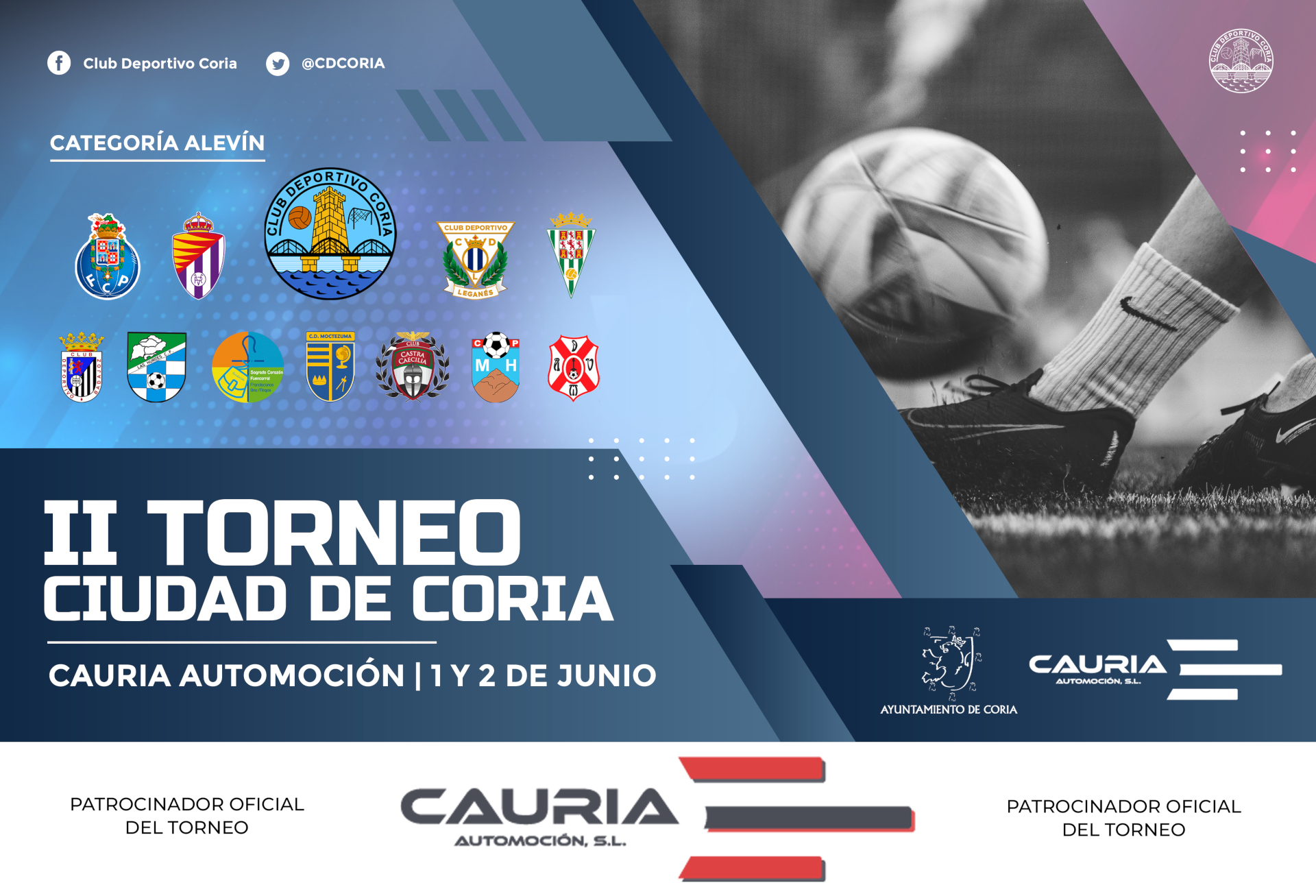 CAMPO MUNICIPAL "CESAR SÁNCHEZ" Crta. Casillas s/n, Coria, Cáceres, EspañaOrganizado por el CD Coria en colaboración con el Ayto. de Coria. El CD Coria se encuentra inmerso en la organización del II Torneo Internacional de Fútbol “Ciudad de Coria”, en la categoría alevín (10-11 años), que se celebrará los dçias 1 y 2 de junio del presente y cuyo patrocinador oficial este año será Cauria Automoción. El torneo se desarrollará de forma paralela en el Estadio “César Sánchez” y en el Estadio “La Isla”, en formato fútbol-8. Los equipos invitados son: Club Deportivo Badajoz, Club Deportivo Leganés, Real Valladolid Club de Fútbol, Córdoba Club de Fútbol (campeón de la primera edición del torneo), Fútbol Club Oporto, Asociación Deportiva Villa de Moraleja, Club Polideportivo Montehermoso, Las Hurdes Club de Fútbol, Club Castra Caecilia (Cáceres), Club Deportivo Moctezuma (Cáceres), Sagrado Corazón de Fuencarral (Madrid), más el equipo Alevín A, forman el cartel de este año.