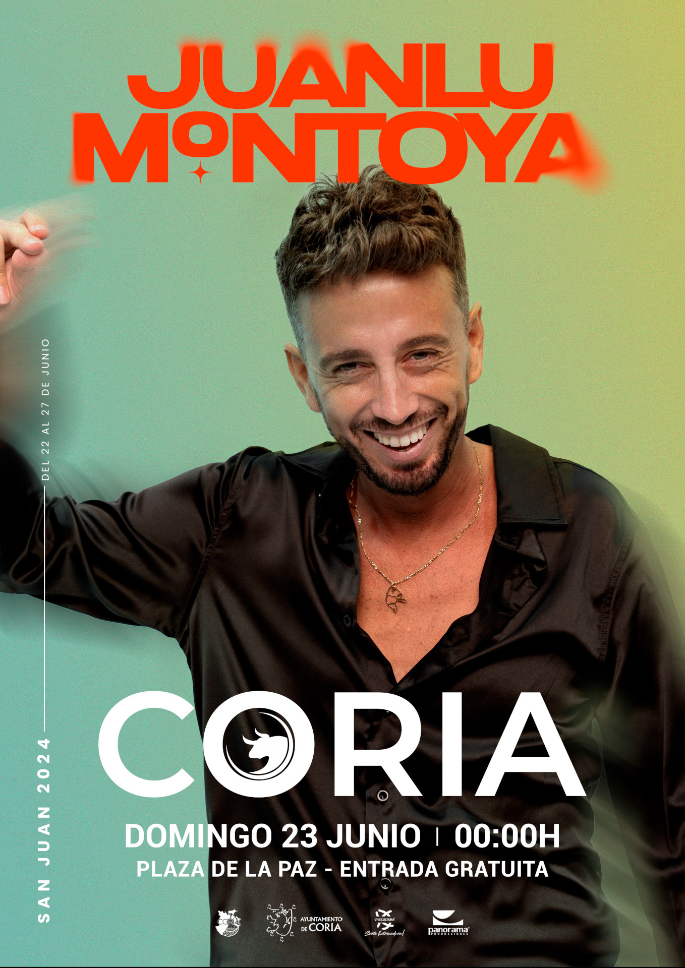 Plaza de la Paz Plaza de la Paz, s/n, Coria, Cáceres, EspañaJuanlu Montoya es un talentoso cantante y guitarrista flamenco andaluz, cuya música cautiva a los oyentes con su pasión y virtuosismo. Con una voz profunda y emotiva, Juanlu interpreta el flamenco con una intensidad que llega directamente al corazón. Su habilidad en la guitarra flamenca es excepcional, creando melodías complejas y ritmos envolventes que transportan a los espectadores a las raíces del género. Con una trayectoria sólida y un estilo inconfundible, Juanlu Montoya se ha ganado el reconocimiento como uno de los grandes talentos del flamenco contemporáneo.