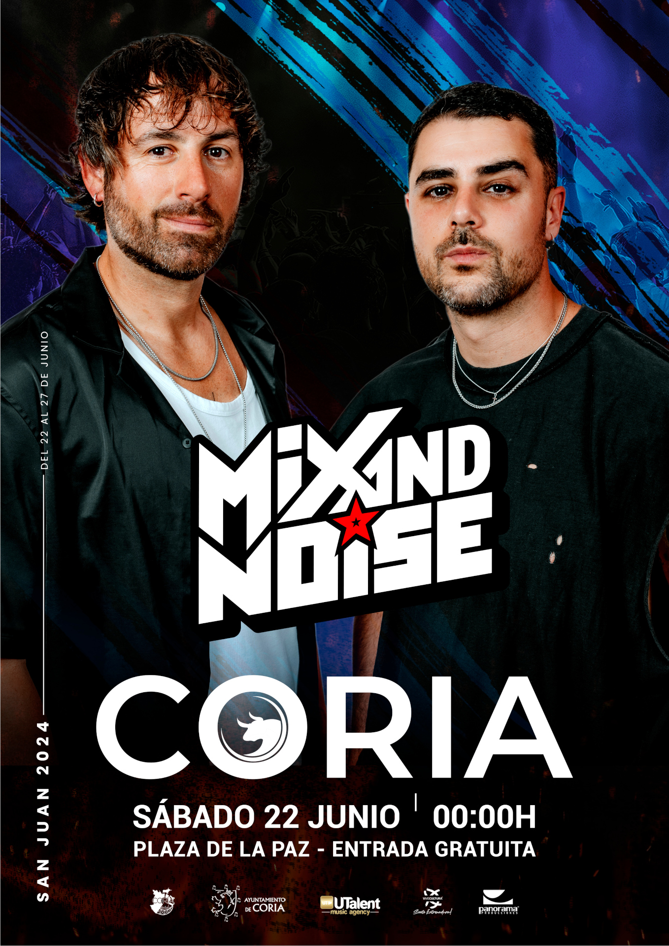 Plaza de la Paz Plaza de la Paz, s/n, Coria, Cáceres, EspañaMix and Noise. Mix and Noise es un grupo musical innovador que fusiona ritmos electrónicos con sonidos orgánicos, creando una experiencia auditiva única y emocionante para sus seguidores. Con una energía contagiosa en el escenario y letras que invitan a la reflexión, Mix and Noise se ha ganado un lugar destacado en la escena musical actual. Su propuesta fresca y vanguardista los ha convertido en una de las bandas más prometedoras del momento, atrayendo a fans de todas partes con su estilo inconfundible y su pasión por la música. ¡No te pierdas la oportunidad de sumergirte en el mundo sonoro de Mix and Noise!