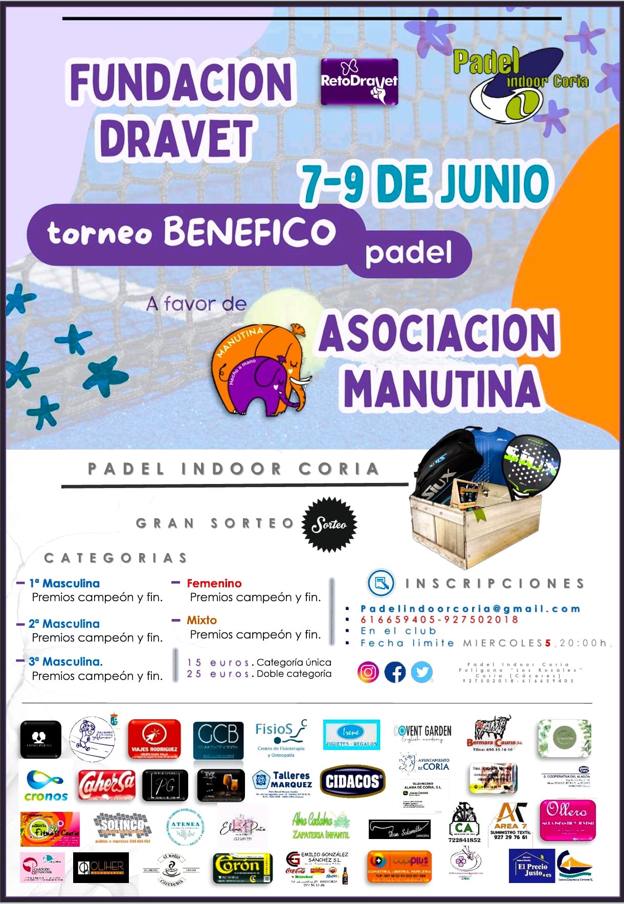 Padel Indoor Coria Valle del Alagón, 58, Coria, EspañaInscripciones: padelindoorcoria@gmail.com contacto: 616.65.94.05 Categorías: primera, segunda, tercera, masculina, femenina y mixta. Organiza: Pádel Indoor Coria.
