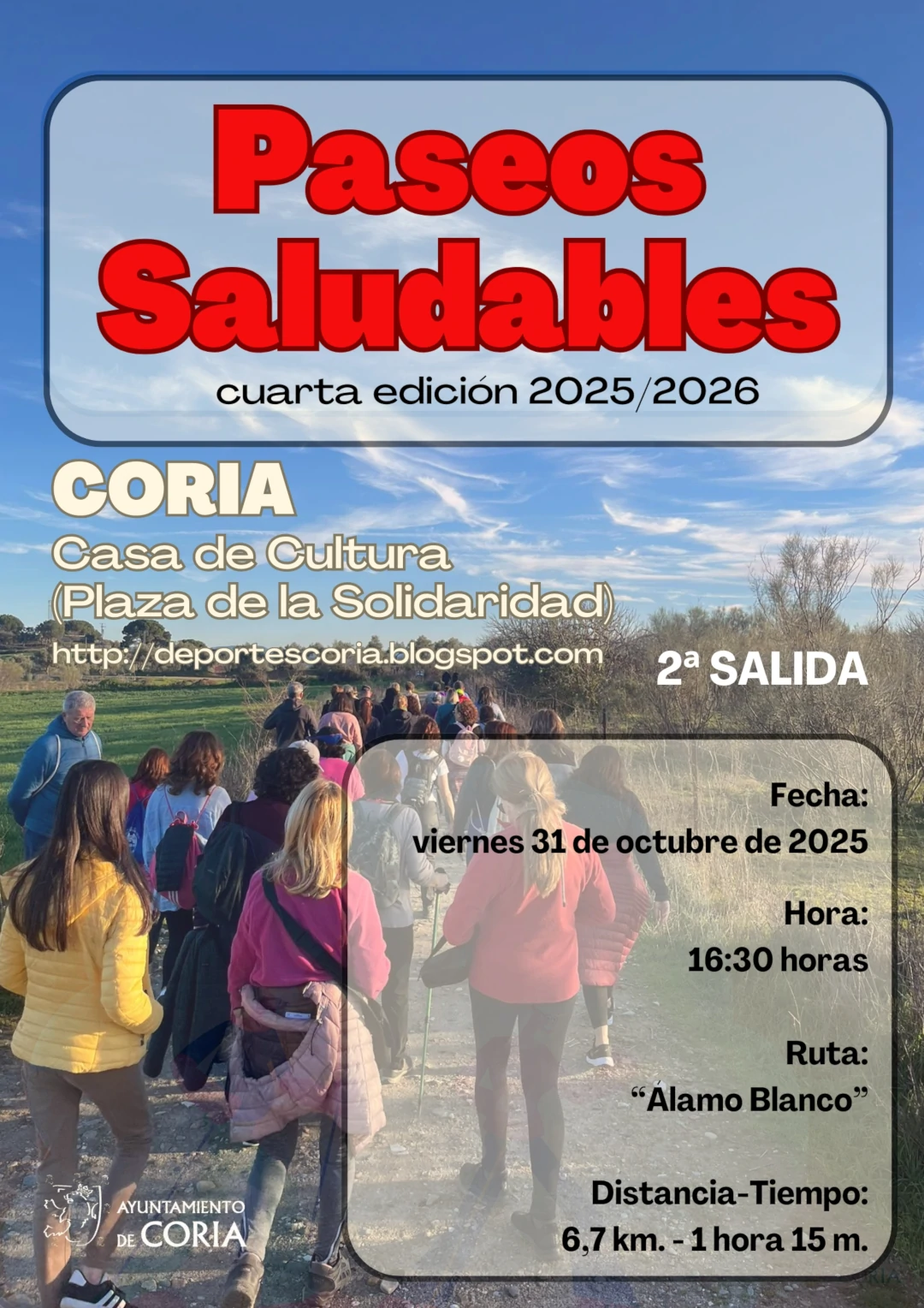 Informamos sobre la segunda Salida de los Paseos Saludables que la Concejalía de Deportes de Coria tiene programada para esta temporada 2025/2026, estando establecida para el viernes 31 de octubre, con horario de salida a las 16:30 horas desde la Plaza de la Solidaridad (Casa de Cultura), cuyo itinerario previsto será “Álamo Blanco”, un recorrido […]