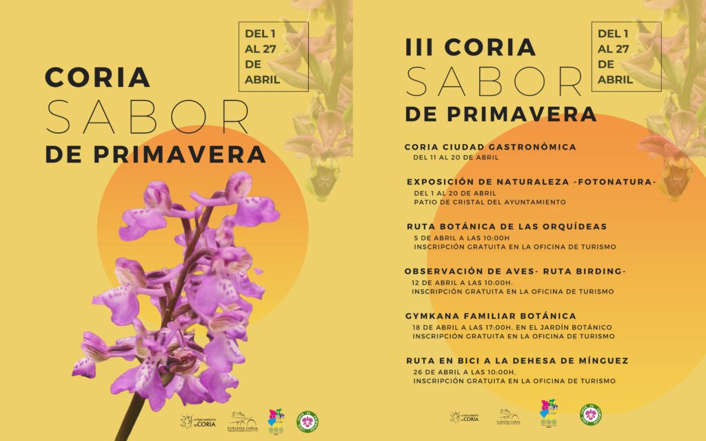 A su vez, tanto la Fiesta Gastronómica como la ya mencionada Semana Santa compartirán protagonismo con otros eventos de turismo de naturaleza al sumarse en su tercera edición ‘Coria Sabor de Primavera’ que del 1 al 27 de abril posee una amplia programación repleta de diversas actividades especialmente dirigidas a los amantes de la naturaleza, la botánica, la ornitología, la cultura, el deporte y la gastronomía, principalmente, para su descubrimiento y disfrute.
