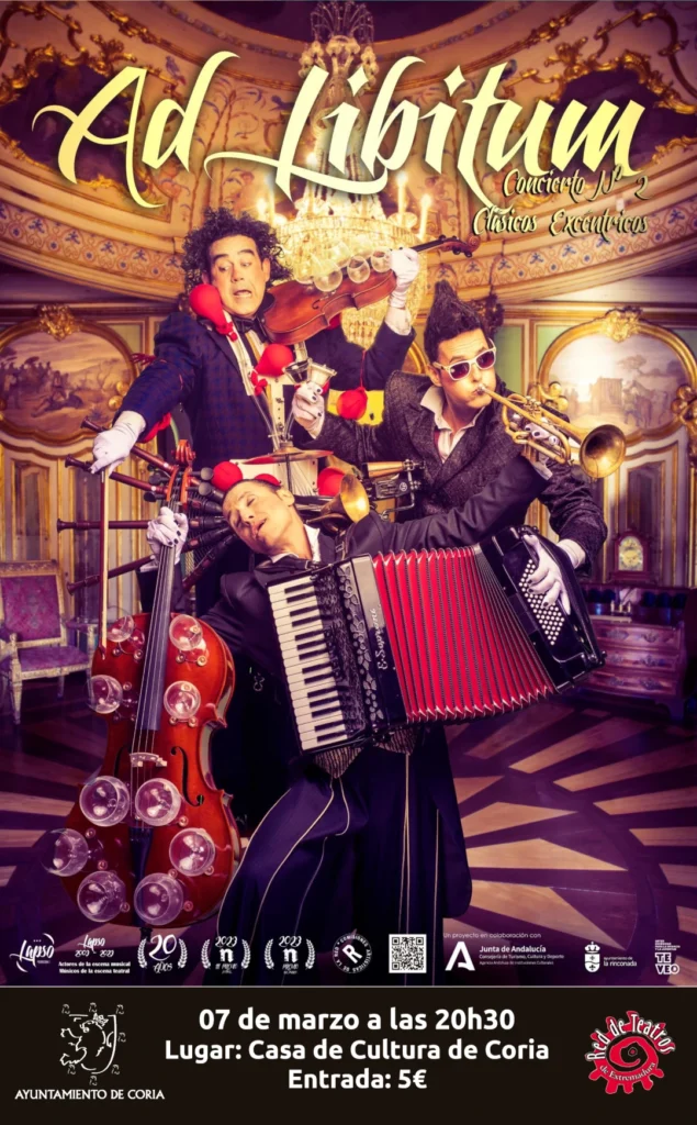 Pero si aplicamos la expresión a un espectáculo completo, el resultado es «Ad Libitum», la nueva creación de Lapso Producciones. Una obra teatral que ofrece un concierto que rompe con lo convencional y reinterpreta grandes obras de la música clásica con instrumentos no convencionales como el Tripticófono Tuboidal, el Serrucho Tenor, el Vidriolín y Vidrioncello Copodivarius, el Destilarmonium Percutente, o las percusiones de Olivetti, entre otros, bajo el prisma del humor blanco, y con total libertad creativa.