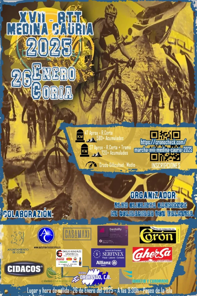 Como ya es tradición en el mes de enero, la Ciudad de Coria acogerá la mítica Marcha BTT «Medina Cauria», celebrando su edición décimo séptima, siendo una de las pruebas con más arraigo de la comarca cacereña en esta modalidad de ciclismo de montaña.