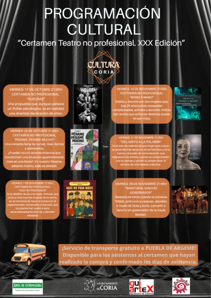 El Ayuntamiento de Coria informa que las representaciones correspondientes al Certamen de Teatro No Profesional “Ciudad de Coria” darán comienzo el próximo viernes 17 de octubre, pero se trasladará a la casa de cultura de Puebla de Argeme.